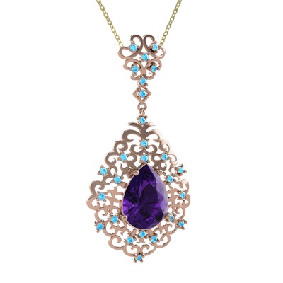 Ametist ve akuamarin 925 ayar rose altın kaplama gümüş kolye (40 cm altın rolo zincir)