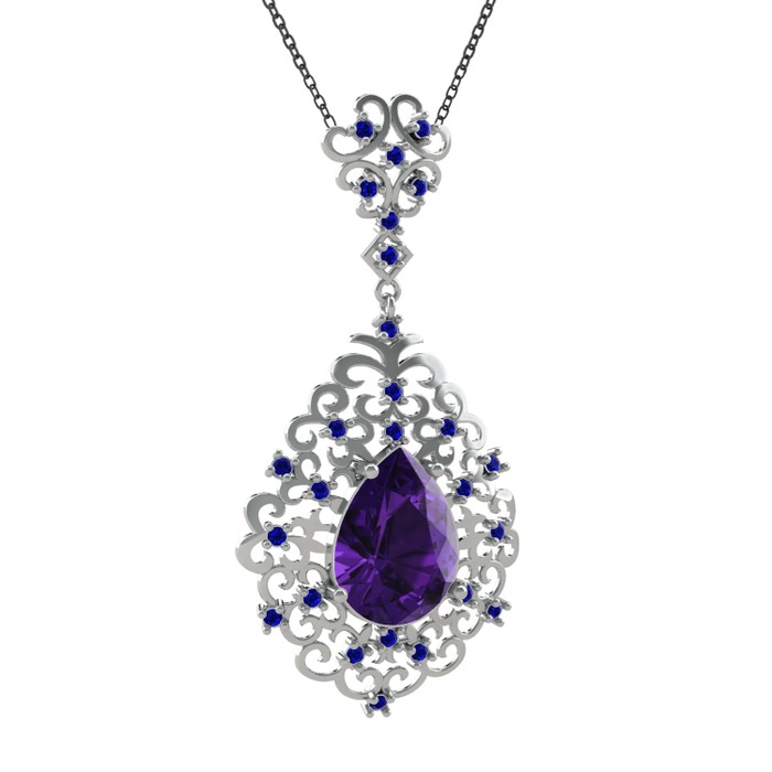 Ametist ve lab safir 14 ayar beyaz altın kolye (40 cm gümüş rolo zincir)
