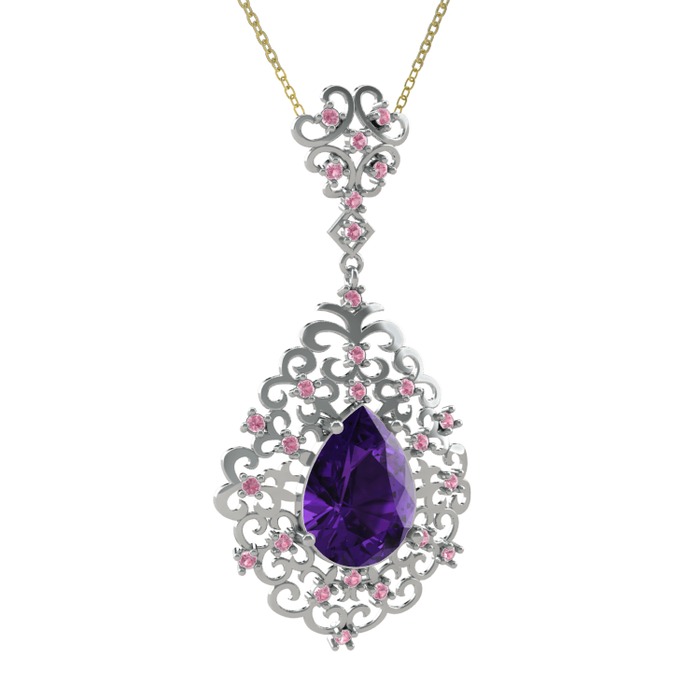 Ametist ve pembe kuvars 18 ayar beyaz altın kolye (40 cm altın rolo zincir)