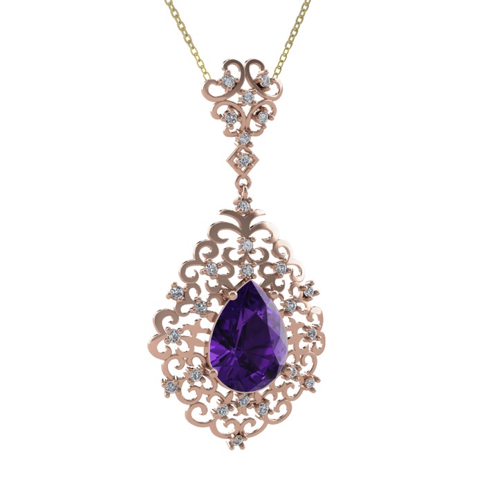 Ametist ve pırlanta 18 ayar rose altın kolye (0.52 karat, 40 cm altın rolo zincir)