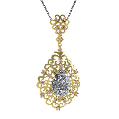 Beyaz zirkon ve pembe kuvars 14 ayar altın kolye (40 cm gümüş rolo zincir)