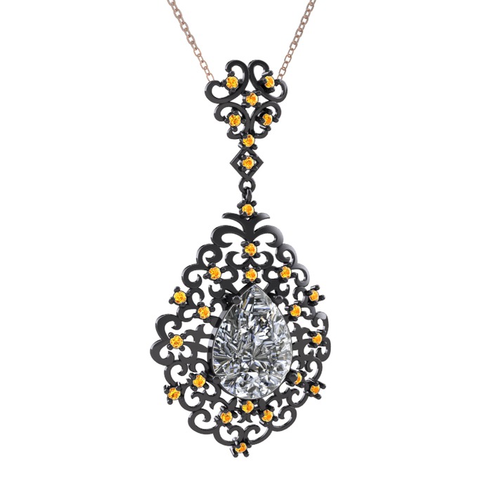 Beyaz zirkon ve sitrin 925 ayar siyah rodyum kaplama gümüş kolye (40 cm rose altın rolo zincir)