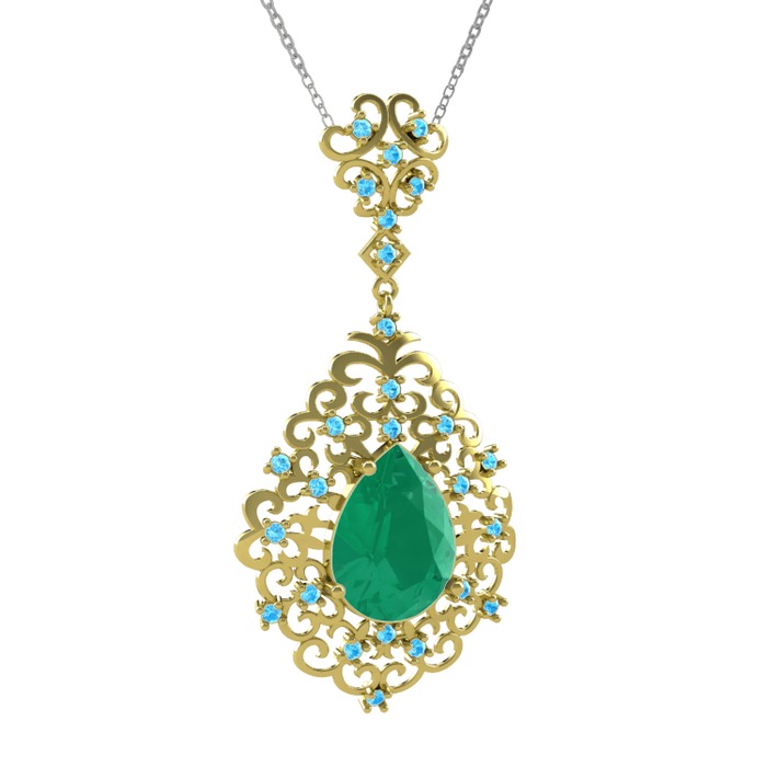 Kök zümrüt ve akuamarin 8 ayar altın kolye (40 cm beyaz altın rolo zincir)