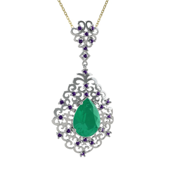 Kök zümrüt ve ametist 8 ayar beyaz altın kolye (40 cm altın rolo zincir)