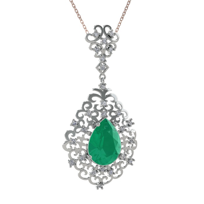 Kök zümrüt ve beyaz zirkon 925 ayar gümüş kolye (40 cm rose altın rolo zincir)