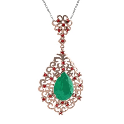 Kök zümrüt ve garnet 8 ayar rose altın kolye (40 cm gümüş rolo zincir)