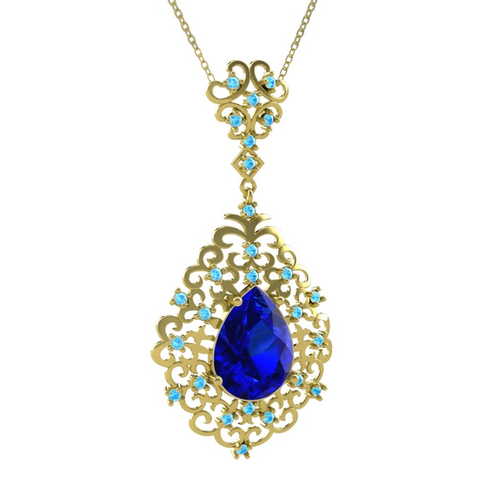 Lab safir ve akuamarin 925 ayar altın kaplama gümüş kolye (40 cm altın rolo zincir)