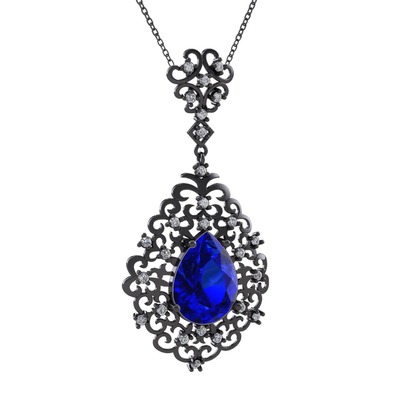 Lab safir ve pırlanta 925 ayar siyah rodyum kaplama gümüş kolye (0.52 karat, 40 cm gümüş rolo zincir)
