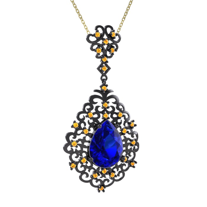Lab safir ve sitrin 925 ayar siyah rodyum kaplama gümüş kolye (40 cm altın rolo zincir)