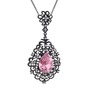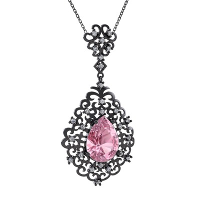 Pembe kuvars ve beyaz zirkon 925 ayar siyah rodyum kaplama gümüş kolye (40 cm gümüş rolo zincir)