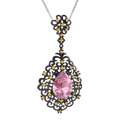 Pembe kuvars ve sitrin 925 ayar siyah rodyum kaplama gümüş kolye (40 cm gümüş rolo zincir)