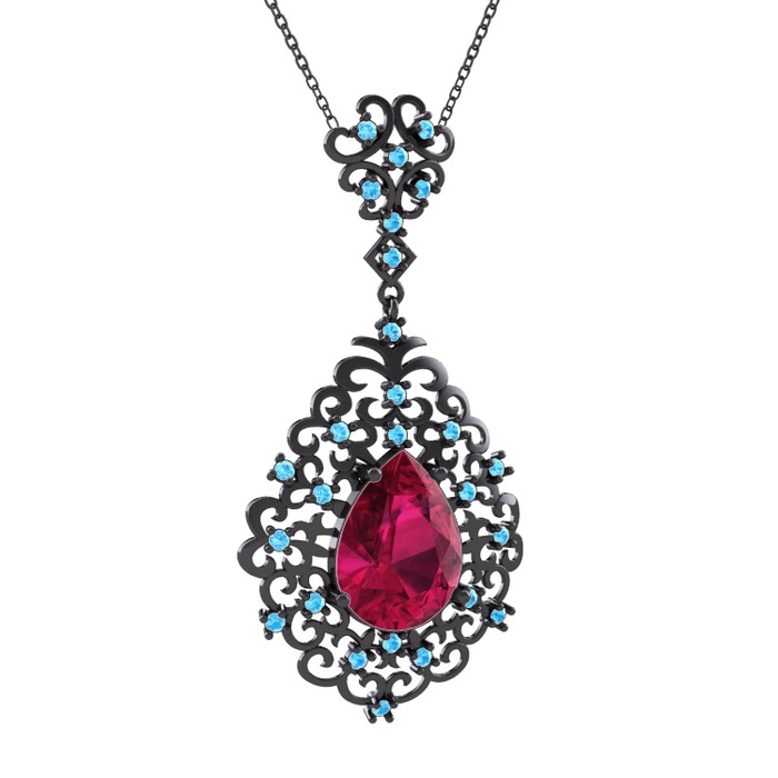 Rodolit garnet ve akuamarin 925 ayar siyah rodyum kaplama gümüş kolye (40 cm gümüş rolo zincir)