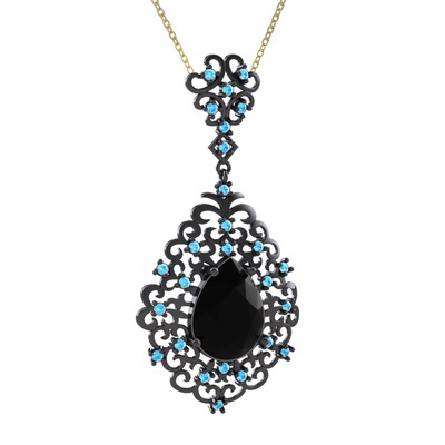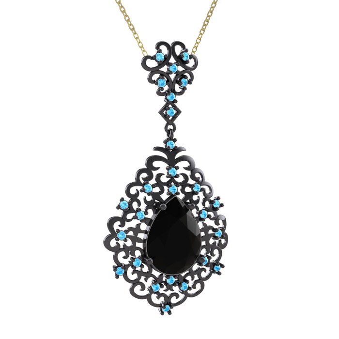 Siyah zirkon ve akuamarin 925 ayar siyah rodyum kaplama gümüş kolye (40 cm altın rolo zincir)