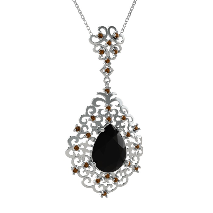 Siyah zirkon ve dumanlı kuvars 14 ayar beyaz altın kolye (40 cm beyaz altın rolo zincir)