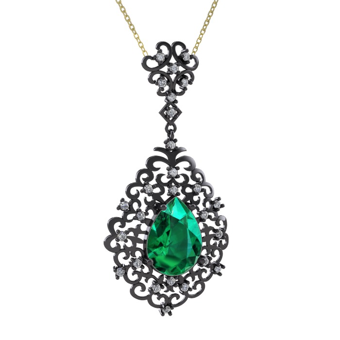 Yeşil kuvars ve pırlanta 925 ayar siyah rodyum kaplama gümüş kolye (0.52 karat, 40 cm gümüş rolo zincir)