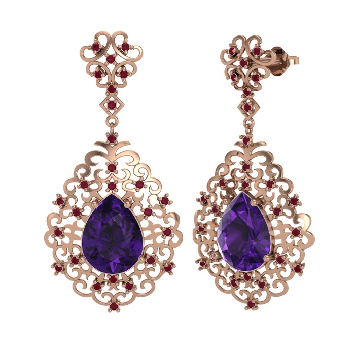 Ametist ve kök yakut 14 ayar rose altın küpe