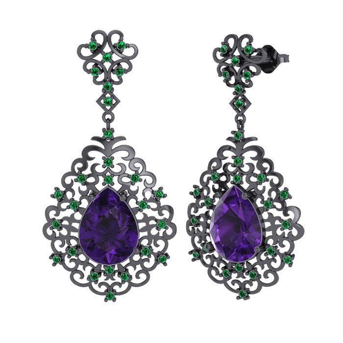 Ametist ve yeşil kuvars 925 ayar siyah rodyum kaplama gümüş küpe