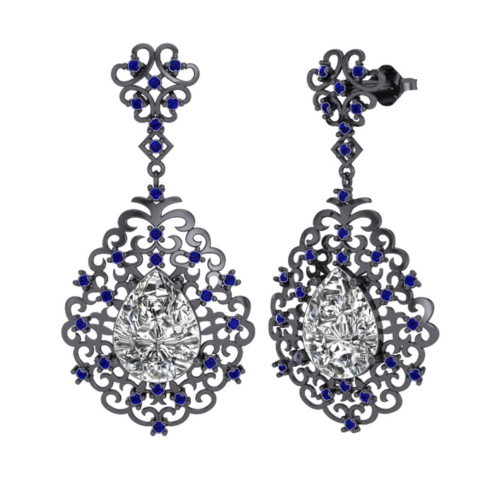 Beyaz zirkon ve lab safir 925 ayar siyah rodyum kaplama gümüş küpe