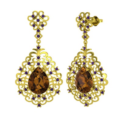 Dumanlı kuvars ve ametist 8 ayar altın küpe