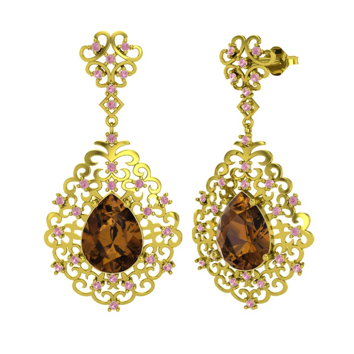 Dumanlı kuvars ve pembe kuvars 14 ayar altın küpe