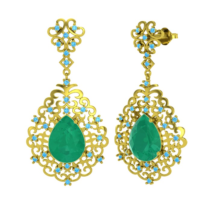 Kök zümrüt ve akuamarin 8 ayar altın küpe