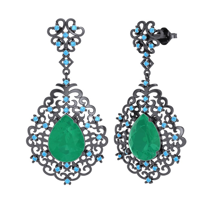 Kök zümrüt ve akuamarin 925 ayar siyah rodyum kaplama gümüş küpe