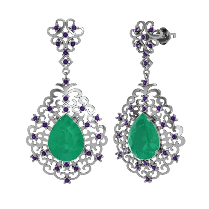 Kök zümrüt ve ametist 18 ayar beyaz altın küpe
