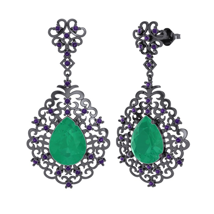 Kök zümrüt ve ametist 925 ayar siyah rodyum kaplama gümüş küpe
