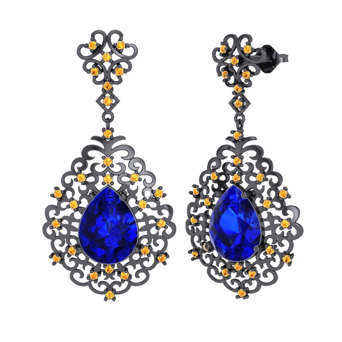 Lab safir ve sitrin 925 ayar siyah rodyum kaplama gümüş küpe