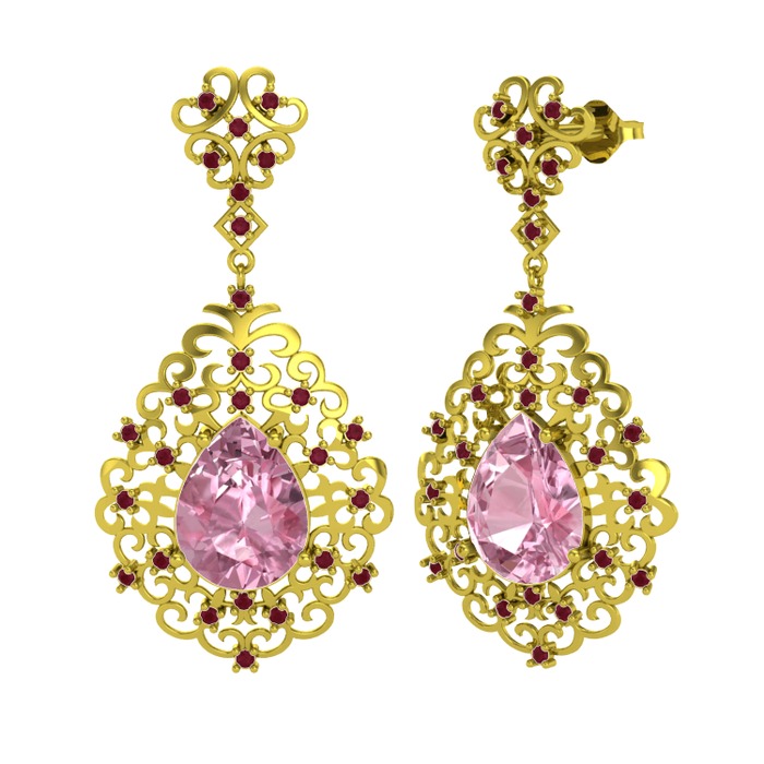 Pembe kuvars ve kök yakut 18 ayar altın küpe