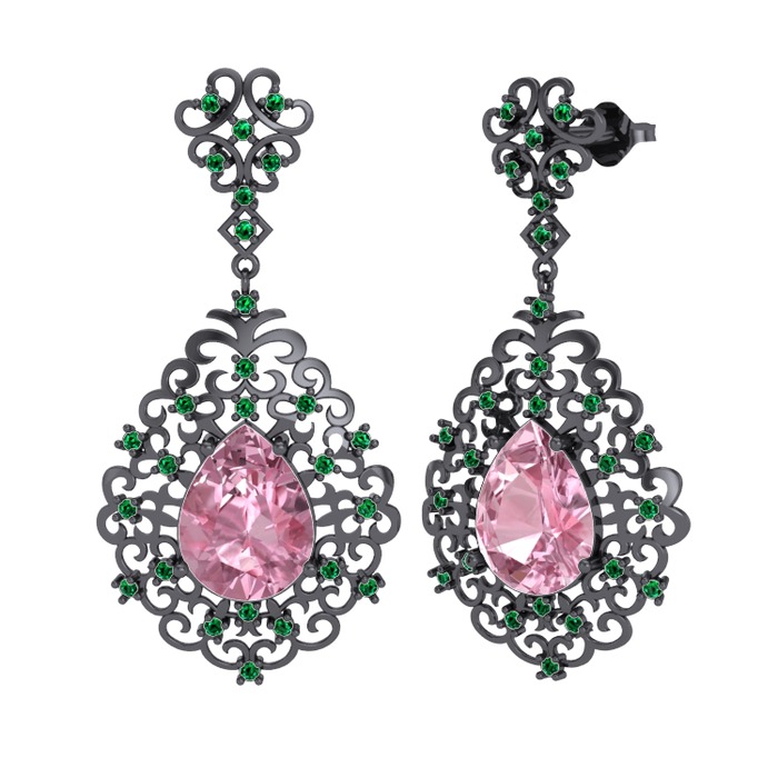 Pembe kuvars ve yeşil kuvars 925 ayar siyah rodyum kaplama gümüş küpe