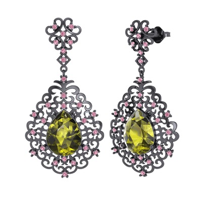 Peridot ve pembe kuvars 925 ayar siyah rodyum kaplama gümüş küpe