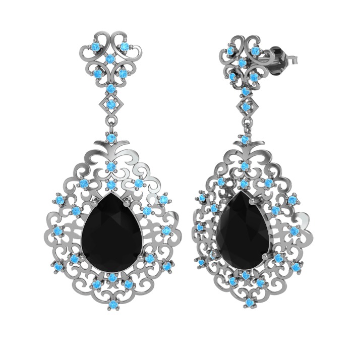 Siyah zirkon ve akuamarin 18 ayar beyaz altın küpe