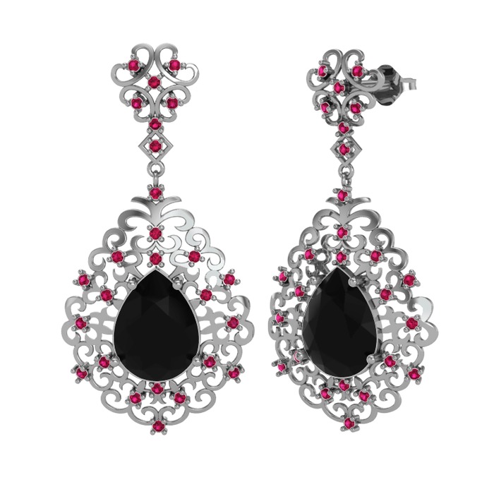 Siyah zirkon ve rodolit garnet 8 ayar beyaz altın küpe