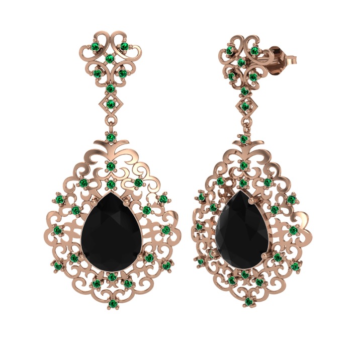 Siyah zirkon ve yeşil kuvars 14 ayar rose altın küpe