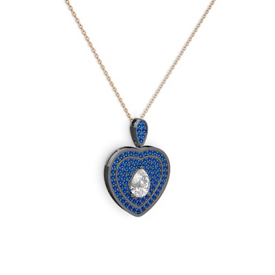 Beyaz zirkon ve lab safir 925 ayar siyah rodyum kaplama gümüş kolye (40 cm rose altın rolo zincir)