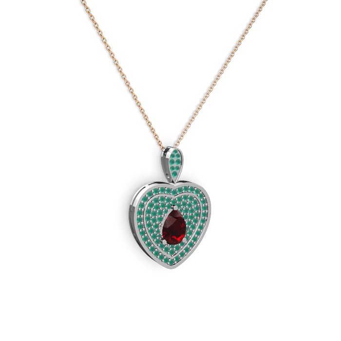 Garnet ve kök zümrüt 18 ayar beyaz altın kolye (40 cm rose altın rolo zincir)