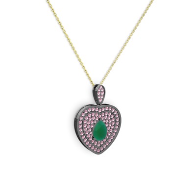 Kök zümrüt ve pembe kuvars 925 ayar siyah rodyum kaplama gümüş kolye (40 cm altın rolo zincir)