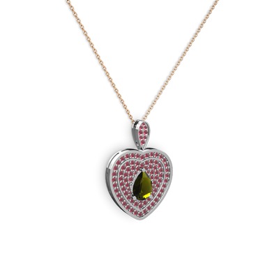Peridot ve kök yakut 14 ayar beyaz altın kolye (40 cm gümüş rolo zincir)