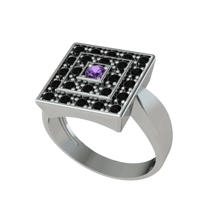 Ametist ve siyah zirkon 18 ayar beyaz altın yüzük