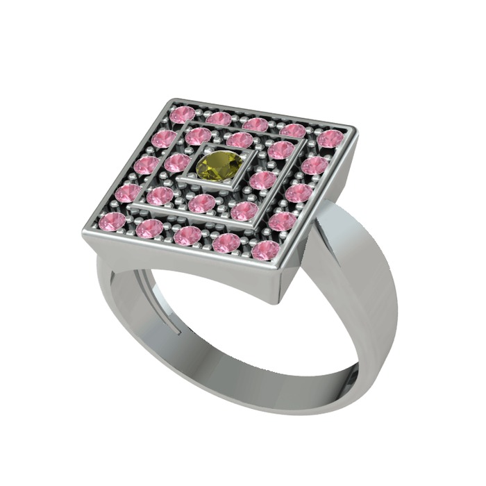 Peridot ve pembe kuvars 8 ayar beyaz altın yüzük