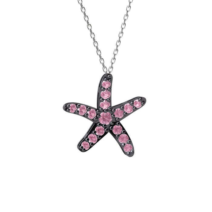 Pembe kuvars 925 ayar siyah rodyum kaplama gümüş kolye (40 cm beyaz altın rolo zincir)