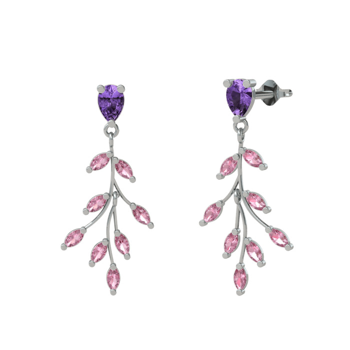 Ametist ve pembe kuvars 18 ayar beyaz altın küpe