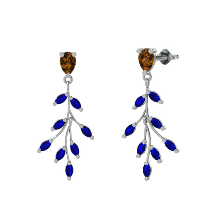 Dumanlı kuvars ve lab safir 8 ayar beyaz altın küpe