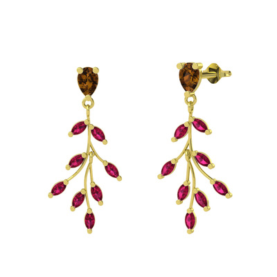 Dumanlı kuvars ve rodolit garnet 14 ayar altın küpe