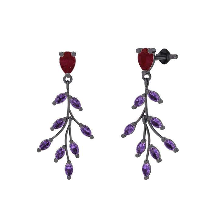 Kök yakut ve ametist 925 ayar siyah rodyum kaplama gümüş küpe