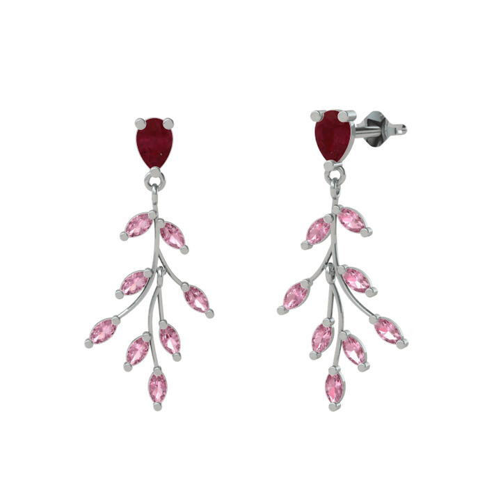 Kök yakut ve pembe kuvars 14 ayar beyaz altın küpe