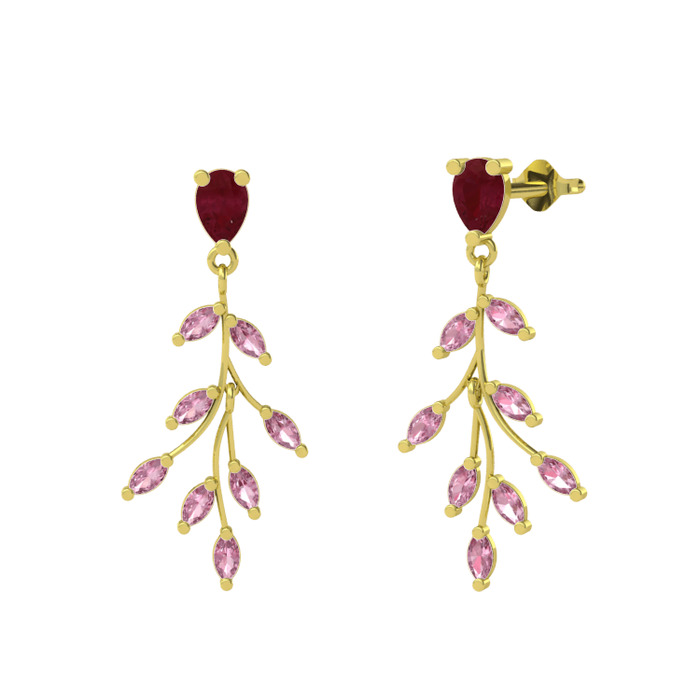 Kök yakut ve pembe kuvars 18 ayar altın küpe