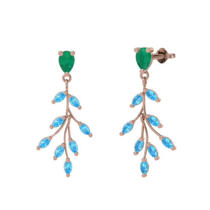 Kök zümrüt ve akuamarin 14 ayar rose altın küpe