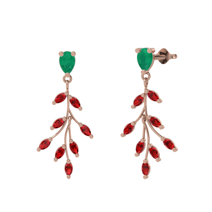 Kök zümrüt ve garnet 14 ayar rose altın küpe